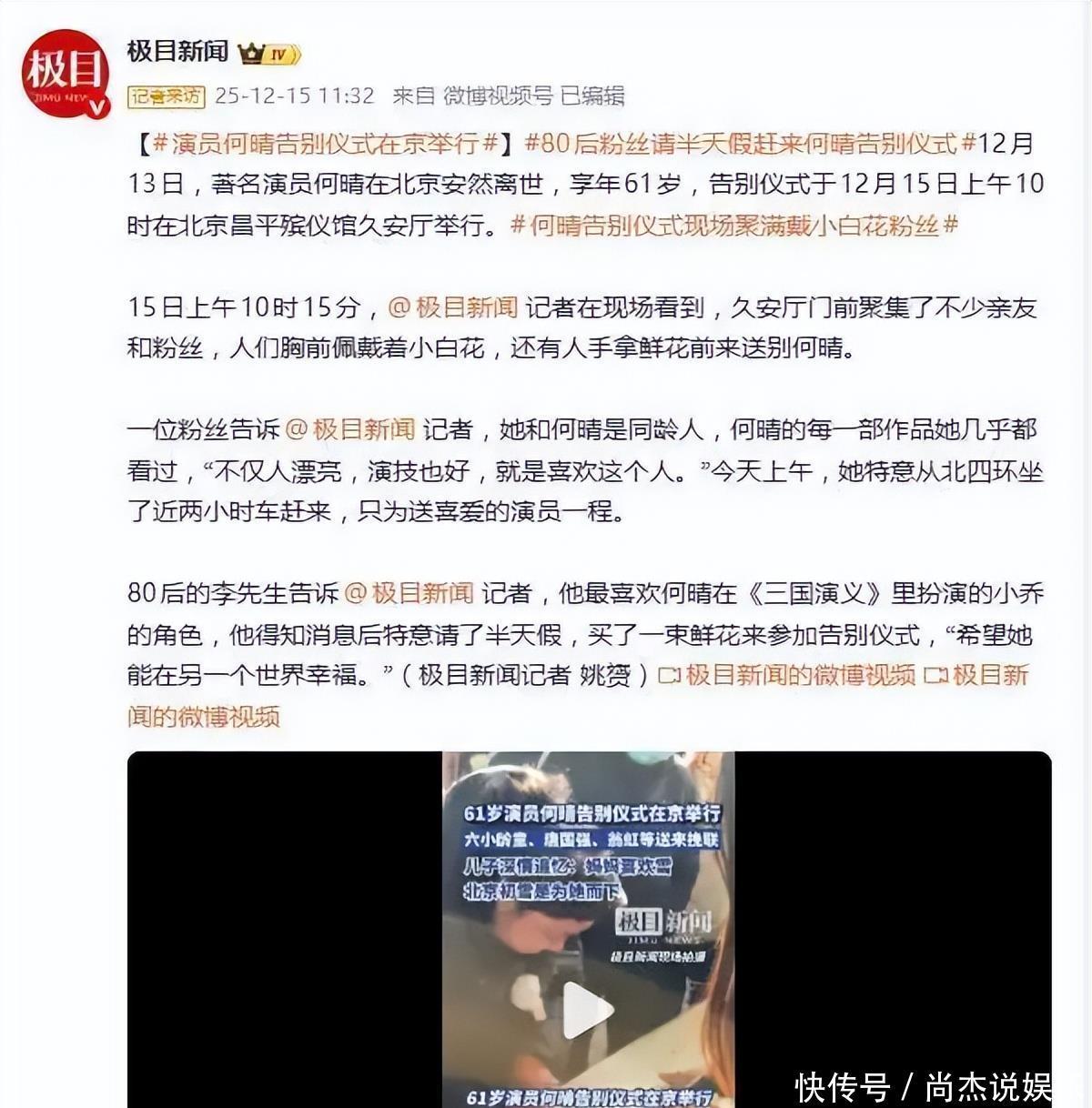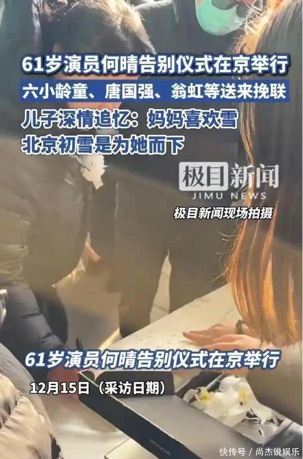 12 月 15 日上午 10 时,北京昌平殡仪馆久安厅前,寒风吹拂着洁白的花束,人群静默肃立。这场特殊的告别仪式,为在 12 月 13 日北京今冬初雪之日安详离世的 “古典第一美女” 何晴而设,这位演遍四大名著的传奇演员,生命永远定格在了 61 岁。风雪赴约:跨越山海的送别上午 10 时许,亲友与粉丝陆续抵达,胸佩白花、手捧鲜花的身影里,满是难掩的哀伤。一位与何晴同龄的女粉丝辗转近两小时从北四环赶来,她坦言几乎看过何晴的每一部作品,“不仅人漂亮,演技也好,就是打心底里喜欢这个人”,只为送心中的女神最后一程。80 后李先生特意请假前来,手中的鲜花承载着对 94 版《三国演义》中小乔的偏爱,“她演的小乔温柔又有风骨,希望她在另一个世界没有病痛,永远幸福”。