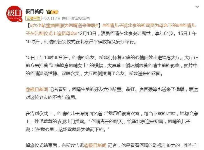 大厅两侧,层层叠叠的花圈与挽联寄托着无尽哀思。浙江昆剧团的老同学六小龄童送来挽联,发文追忆 “何晴同学一路走好”,正是当年他在火车餐车中将何晴引荐给《西游记》导演杨洁,成就了荧屏上的经典角色。未曾谋面的同行翁虹也送上敬意,直言 “能演遍四大名著是演员的莫大福气与实力”,盛赞她的美是 “岁月静好的真诚之美”。唐国强、张山等圈中好友亦通过不同方式表达不舍,追忆她乐观坚韧的过往。仪式中最令人动容的,是何晴儿子的深情追忆。他哽咽着说起母亲的喜好:“我妈妈很喜欢雪,每当下雪就会穿毛茸茸的衣服出门赏雪”。而母亲离世之日恰逢北京初雪,“在我心里,这场雪就是为她而下的”。这句诗意的告白,让在场众人潸然泪下,也为这场告别添上了一抹宿命般的温柔。